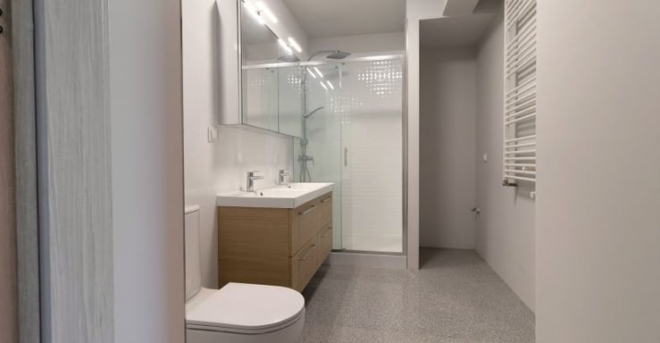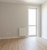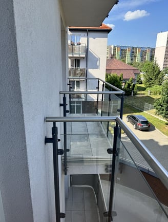 Mieszkanie jest jasne, w 3 pokojach znajdują się okna do ziemi i balkony wykończone szklaną balustradą i betonowymi płytkami bez fug.